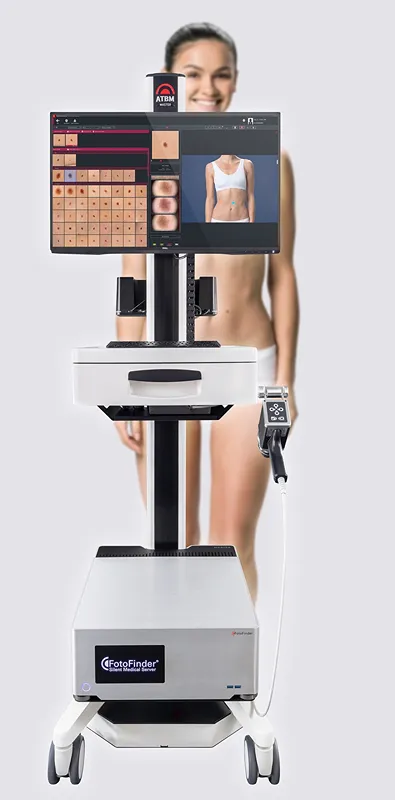 For option A every skin lesion will be examined by the doctor using dermoscopy. Any areas of the body with a high number of moles or any suspicious moles will be imaged with Fotofinder. Then up to 200x magnified and polarised images of all relevant lesions with be recorded and accurately mapped onto the macro image of the body. The highly experienced doctor will assess each lesion, and in addition Artificial Intelligence scoring can be used for a second opinion. There is also the option of having the images sent to you.